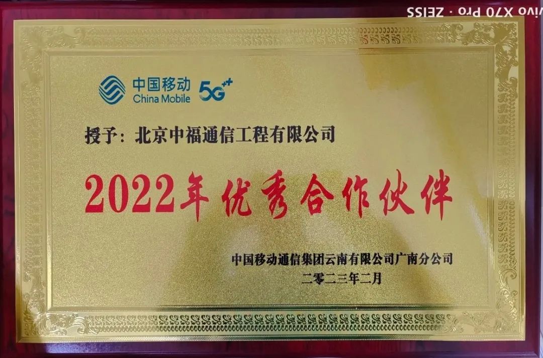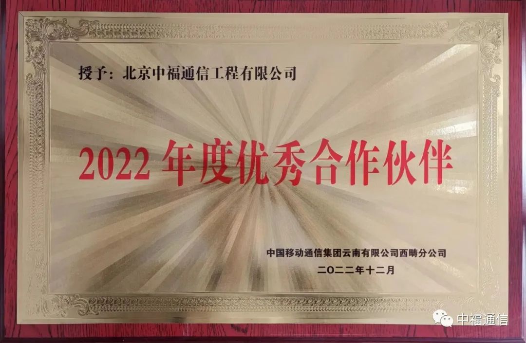 2022年12月,文山項目部在2022年12月獲得了中國移動通信集團(tuán)云南有限公司西疇分公司及中國移動通信集團(tuán)云南有限公司廣南分公司頒發(fā)的“2022年度優(yōu)秀合作伙伴”獎牌。