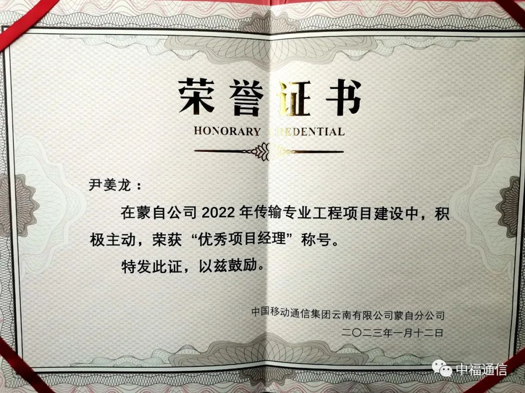 紅河項目部尹姜龍在2023年1月獲得中國移動通信集團(tuán)云南有限公司蒙自分公司“優(yōu)秀項目經(jīng)理”稱號。